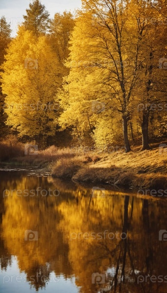 Яркие желтые листья создают потрясающий осенний дисплей вокруг спокойного озера, с отражениями, отражающими листву на поверхности воды, когда день подходит к концу. Генерирующий ИИ