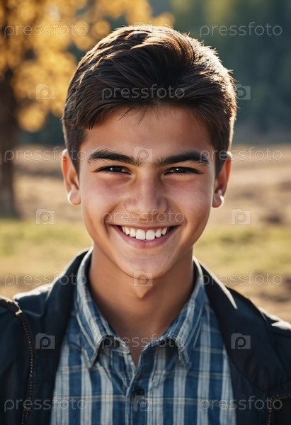 Радостный симпатичный таджикский мальчик 18 лет сияет от счастья, стоя в живописном пейзаже, окруженном красотой природы во время теплого, золотого часового света. Счастливый улыбающийся брюнет. генерируемый