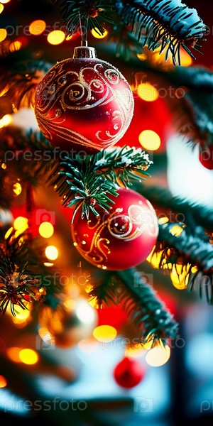 Красочные рождественские украшения украшают ветви елки, яркие шары в оттенках красного и розового, олицетворяющие праздничное настроение зимой. С Новым годом искусство боке фон. Генеративный ИИ