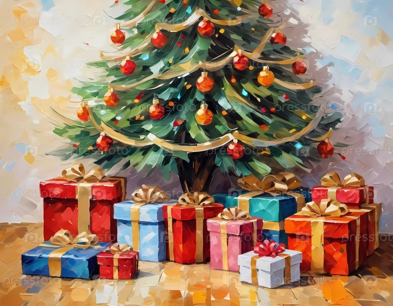 Украшенная рождественская елка, украшенная красочными украшениями и уложенными подарками, готова к празднованию в уютной праздничной обстановке. Обернутые подарки различных цветов. Праздничная атмосфера, тепло и радость. ИИ