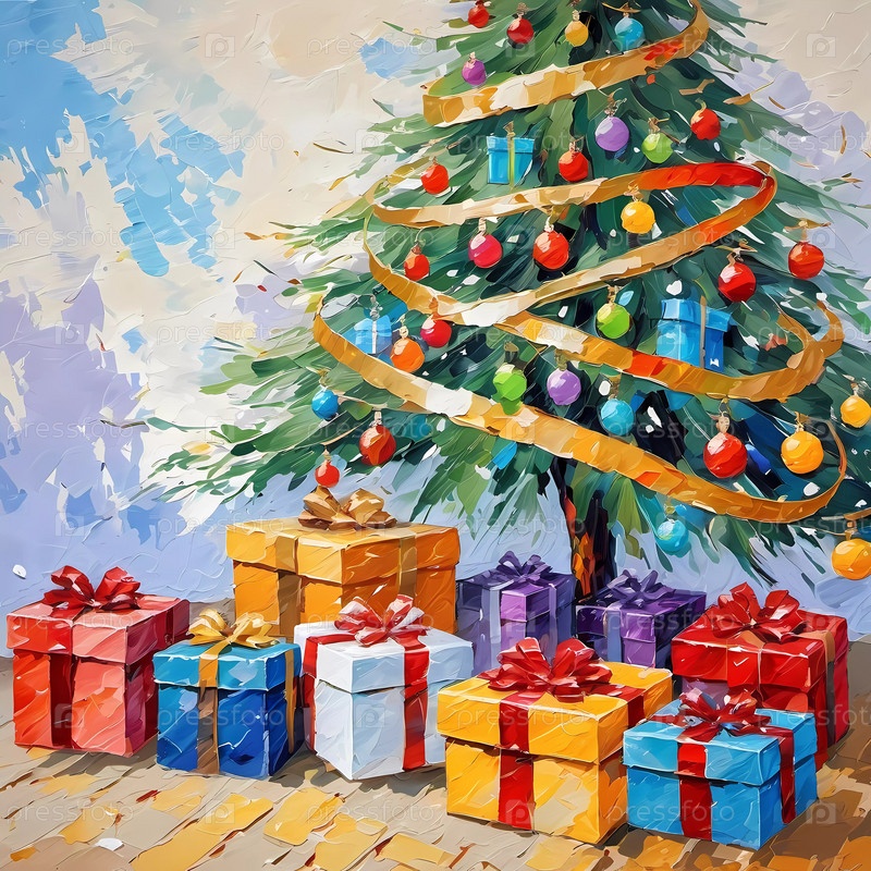 Украшенная рождественская елка, украшенная красочными украшениями и уложенными подарками, готова к празднованию в уютной праздничной обстановке. Обернутые подарки различных цветов. Праздничная атмосфера, тепло и радость. ИИ