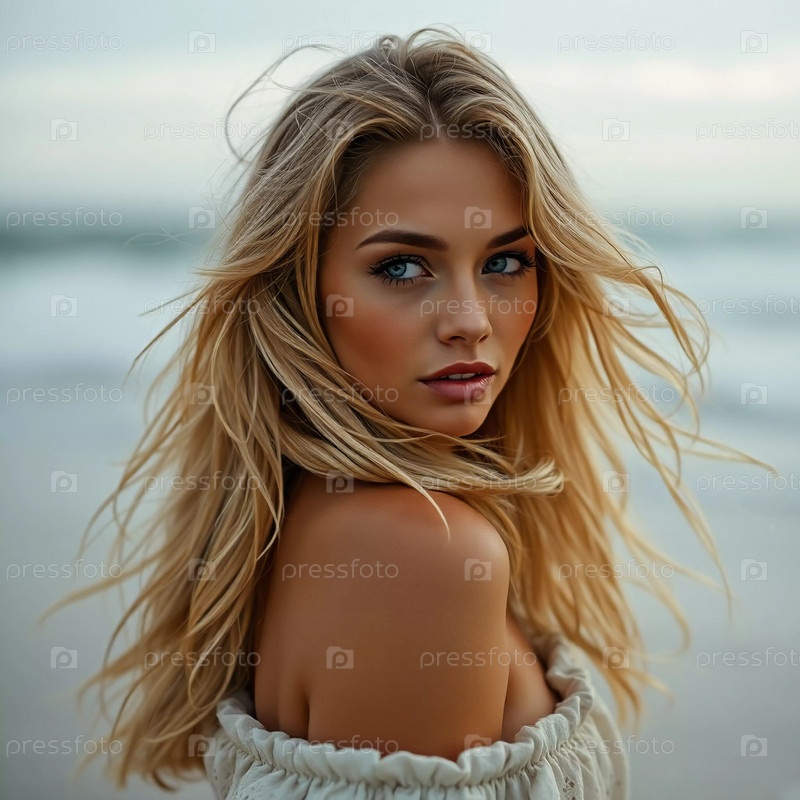 Блондинка в купальнике смотрит назад, стоя у береговой линии. Нежные морские волны лазают у ее ног под ясным голубым небом. Длинные волосы, красивое молодое лицо. Реклама путешествий и одежды. ИИ