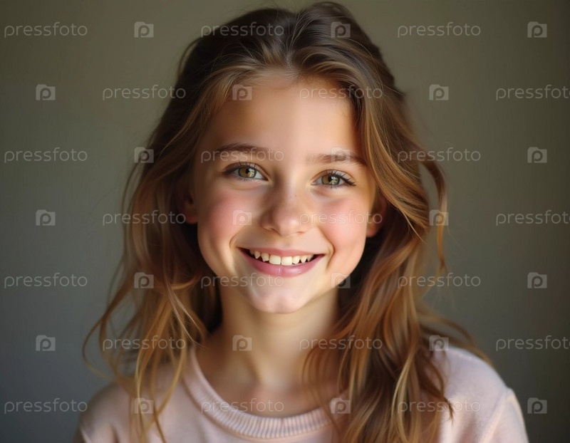 Молодая кавказская девушка с красивыми глазами и волнистыми волосами мягко улыбается. Ее игривое поведение сияет, когда она позирует в уютной обстановке в помещении во Франции. Генеративный ИИ