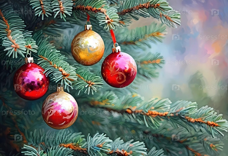 Искрометные орнаментные шары в ярком красном и золотом свисают с пышной ветки елового дерева. Мягкие, теплые огни мерцают, усиливая праздничный дух Рождества. С Новым годом. Художественный рисунок. Генерирующий ИИ