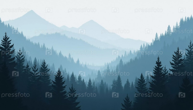 Мирный вид разворачивается с высокими еловыми деревьями, обрамляющими величественные горы, купающиеся в мягком утреннем свете. Пышный зеленый лес спускается в туманную долину, создавая безмятежную атмосферу. Генеративный ИИ
