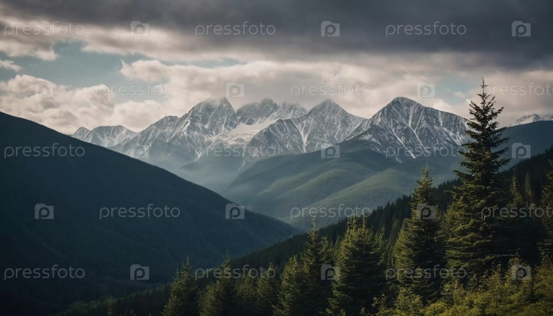Величественные горы возвышаются над безмятежным еловым лесом под драматическим небом, демонстрируя красоту природы в сумерках. Высокие горы с холмами и угрюмым небом, освещающим мирную пустыню. ИИ