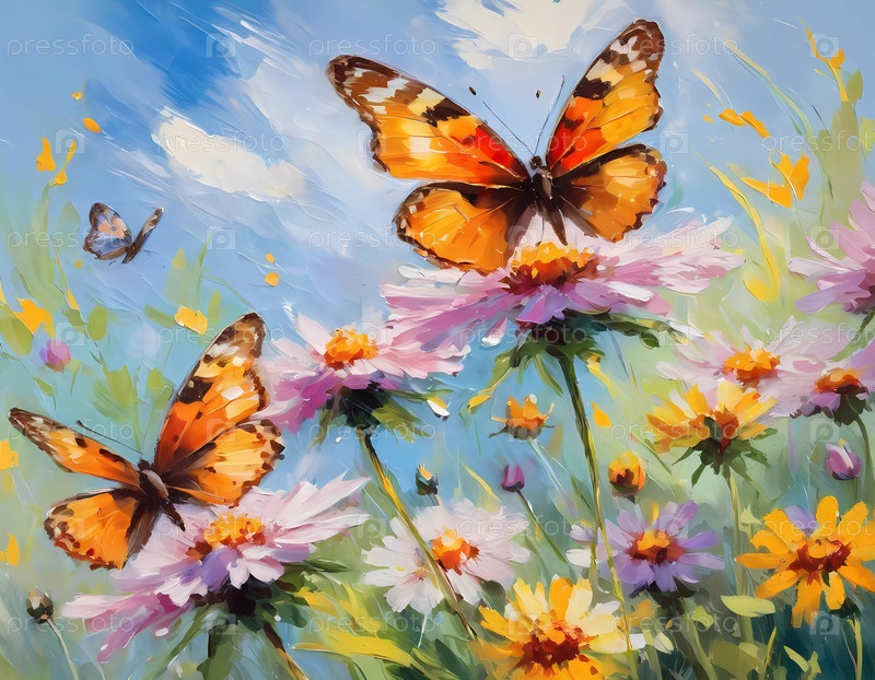 Красочные бабочки грациозно развеваются над ярким массивом полевых цветов, создавая живую и веселую атмосферу на освещенном солнцем лугу. Генеративный ИИ