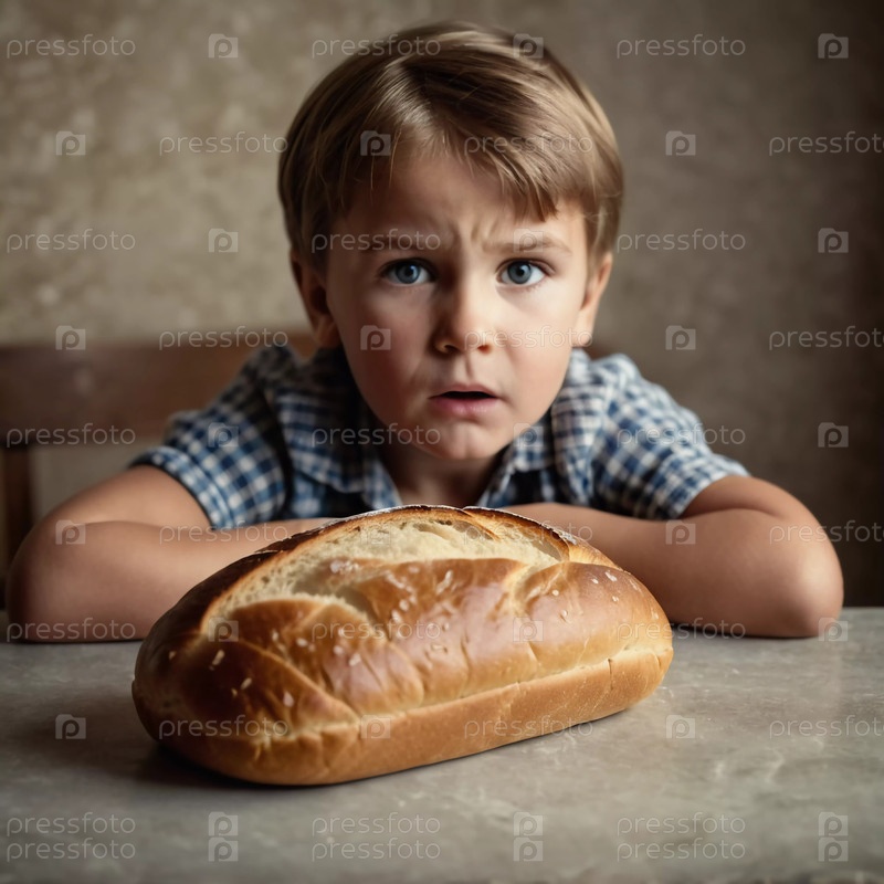Маленький ребенок испытывает разочарование, глядя на свежеиспеченную буханку хлеба в мягко освещенной комнате. Атмосфера теплая, но контрастирует с несчастливым выражением ребенка. Генерирующий ИИ