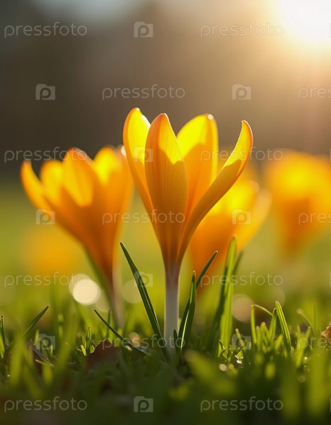 Нежный желтый цвет крокуса цветет в пышной зеленой траве, солнечный свет в спокойной весенней обстановке. Возрождение природы. Шафран Крокус является родом многолетних луковичных травных растений семейства Iris Iridaceae