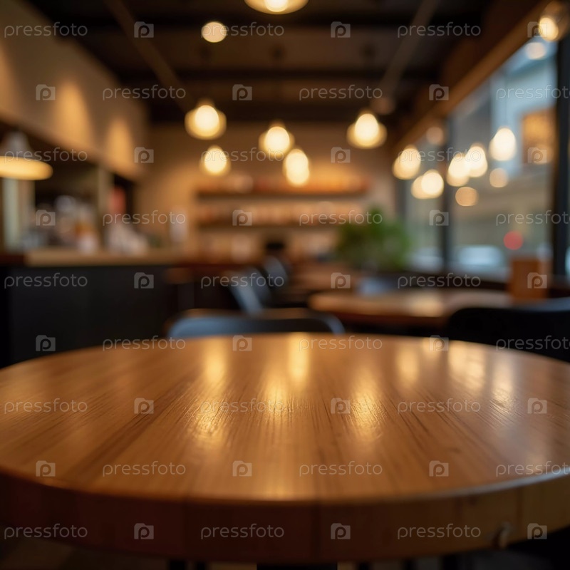 Теплый деревянный стол создает уютную атмосферу в шумном кафе. Мягкие огни освещают фон, где посетители наслаждаются напитками и беседами. Генерирующий ИИ
