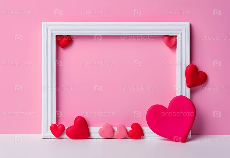 Игривый каркас на тему сердца демонстрирует множество красных и розовых сердец на мягком розовом фоне, обеспечивая идеальное пустое пространство для настройки и творчества. Генерирующий ИИ