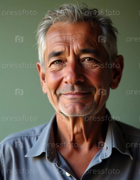 Бразилец в зрелые годы улыбается с теплотой, его серебристые волосы добавляют характер к его выражению. Мягкие цвета фона усиливают его приглашающее поведение