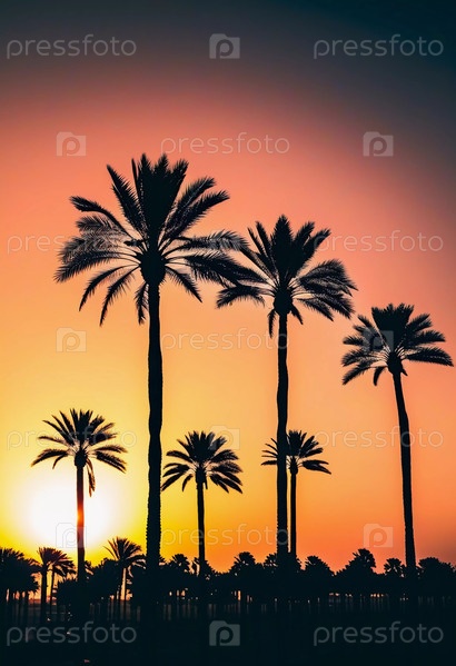 Силуэтированные пальмы мягко качаются, когда солнце спускается, рисуя небо с оттенками оранжевого и фиолетового. Идеальный момент для размышлений и релаксации в конце дня