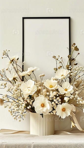 Расположение цветов гипсофила и открытки излучает элегантность, плавно смешивая мягкие текстуры и естественные оттенки в минималистическую эстетику, идеально подходящую для любого стиля декора Generative AI