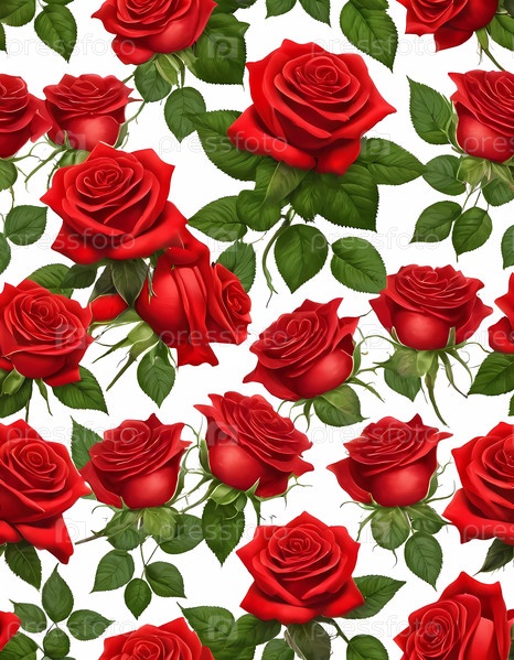 Увлекательное расположение красных роз переплетается с богатыми зелеными листьями, демонстрируя красоту природы через сложные детали и текстуры в восхитительном цветочном узоре