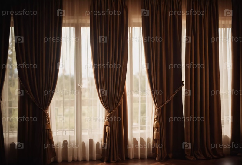 Богатые шелковые шторы украшают просторную комнату, их замысловатый дизайн изящно драпирует. Мягкий солнечный свет проходит, освещая атмосферу и приглашая спокойствие в пространство