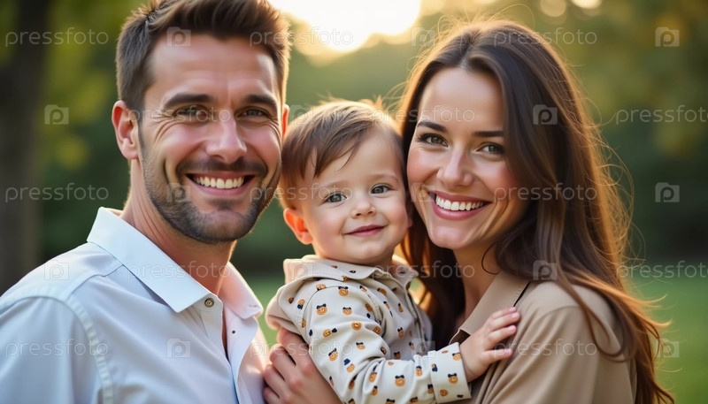 Под сияющим солнцем веселая семья делит прекрасный момент в парке. Родители держат улыбающегося ребенка, демонстрируя радость единения и любви в природе