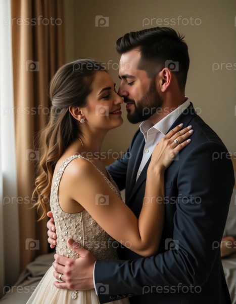 В теплой, приглашающей комнате пара делит интимные объятия, наполненные смехом и любовью, захватывая их любовь в частном праздновании единства