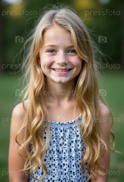 Молодая белорусская девушка стоит в пышном зеленом пейзаже, излучая счастье. Ее длинные волнистые светлые волосы ловят солнечный свет, в то время как ее сияющая улыбка выражает чистую радость