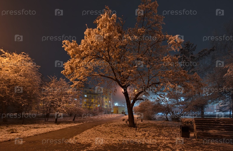 Новокузнецк, Россия. 01 ноября 2024 года. Живописный вид на деревья городского парка, покрытые первым осенним снегом и подсвеченные фонарями теплого и холодного света
