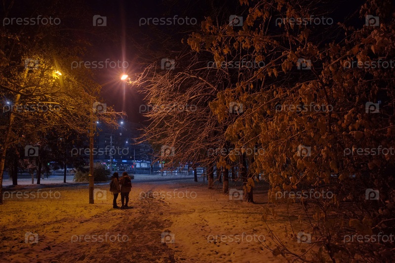 Новокузнецк, Россия. 01 ноября 2024 года. Живописный вид на деревья городского парка, покрытые первым осенним снегом и подсвеченные фонарями теплого и холодного света