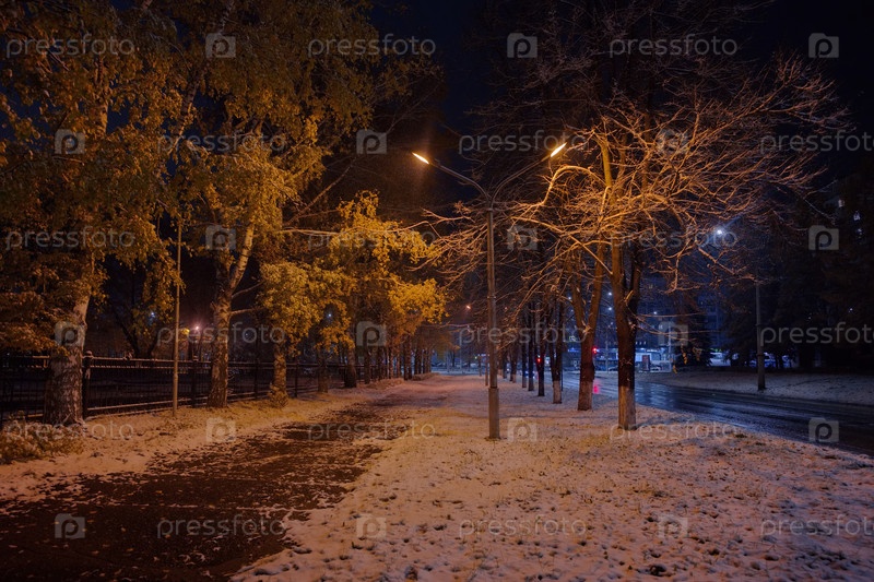 Новокузнецк, Россия. 01 ноября 2024 года. Живописный вид на деревья городского парка, покрытые первым осенним снегом и подсвеченные фонарями теплого и холодного света