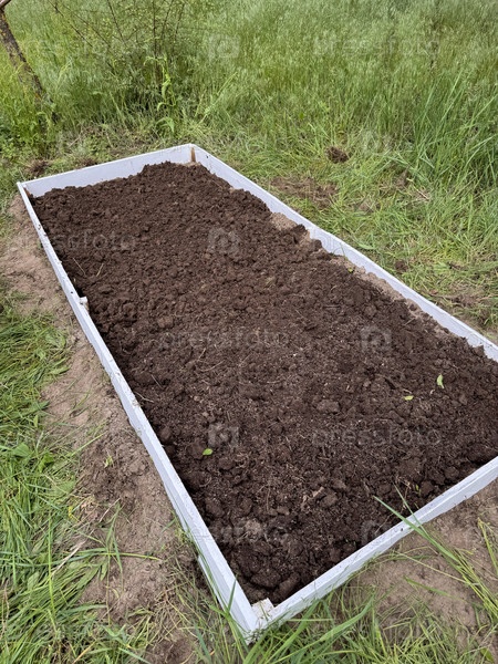 Высокая садовая грядка с деревянным каркасом. Наполнен плодородной почвой