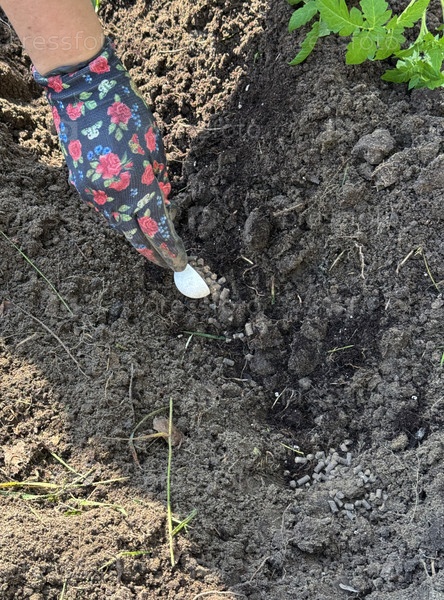 Женщина наливает органическое зернистое удобрение в борозду на садовую кровать