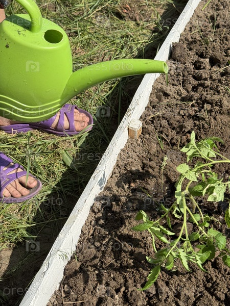 Женщина поливает томатные саженцы, посаженные в садовую грядку лейкой