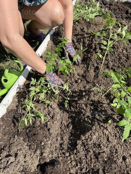 Женщина сажает саженцы томатов в садовую грядку
