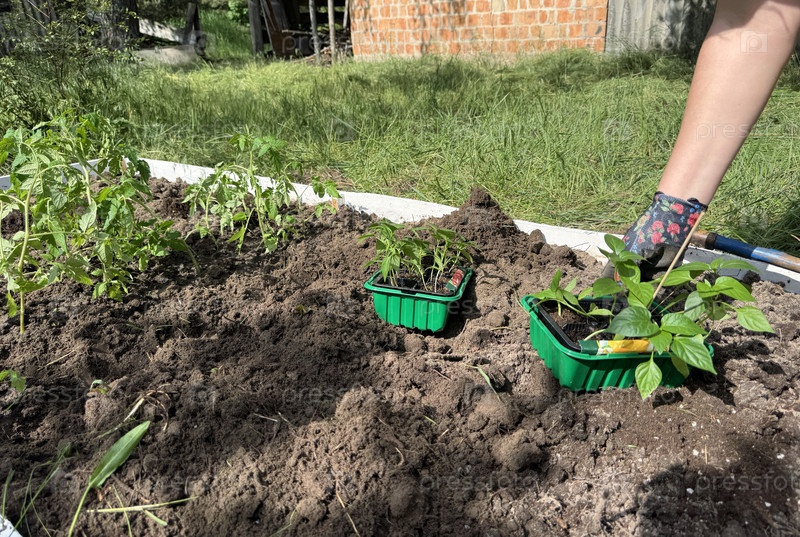 Женщина выносит саженцы перца из пластиковых контейнеров. Поместите их на садовую грядку для посадки