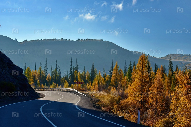Россия. Западная Сибирь, горный Алтай. Контрастный вид на освещенный осенним солнцем желтые лиственницы на фоне тенистых гор на Чуйском тракте вдоль реки Чуя