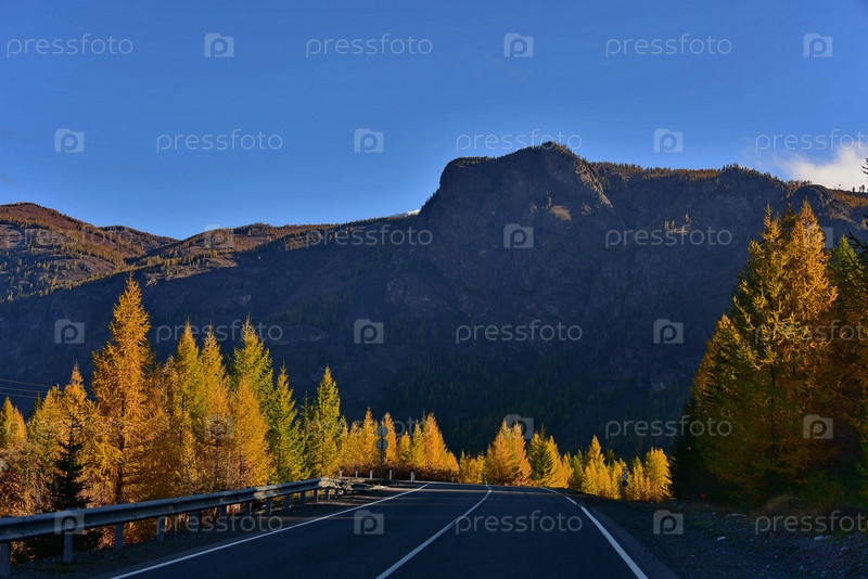 Россия. Западная Сибирь, горный Алтай. Контрастный вид на освещенный осенним солнцем желтые лиственницы на фоне тенистых гор на Чуйском тракте вдоль реки Чуя