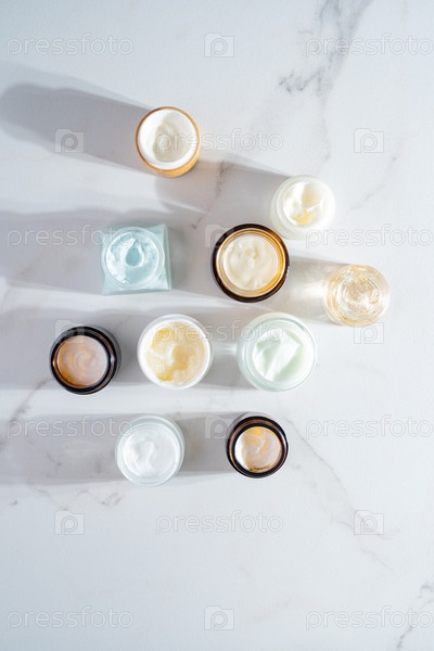 Концепция дневного и ночного лечения. Косметические изделия в различных открытых банках на мраморном фоне, косметический продукт и уход за кожей, концепция косметологии