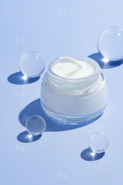 Мокап из стеклянной одежды с кремом для тела или лица на синем фоне со стеклянными шариками. Концепция косметики красоты, натуральных продуктов для увлажнения и восстановления кожи