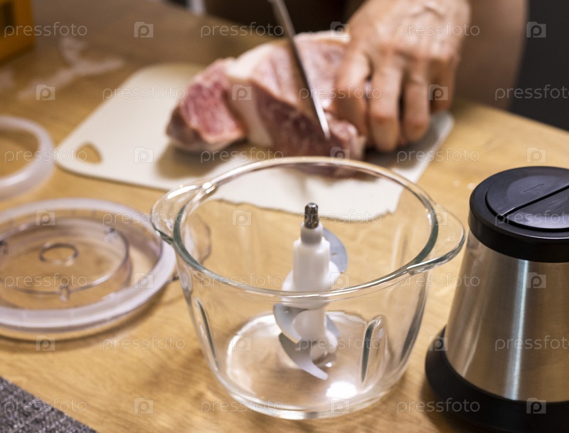 Женщина разрезает мясо, готовит его для измельчения в электрическом вертолете. Еда