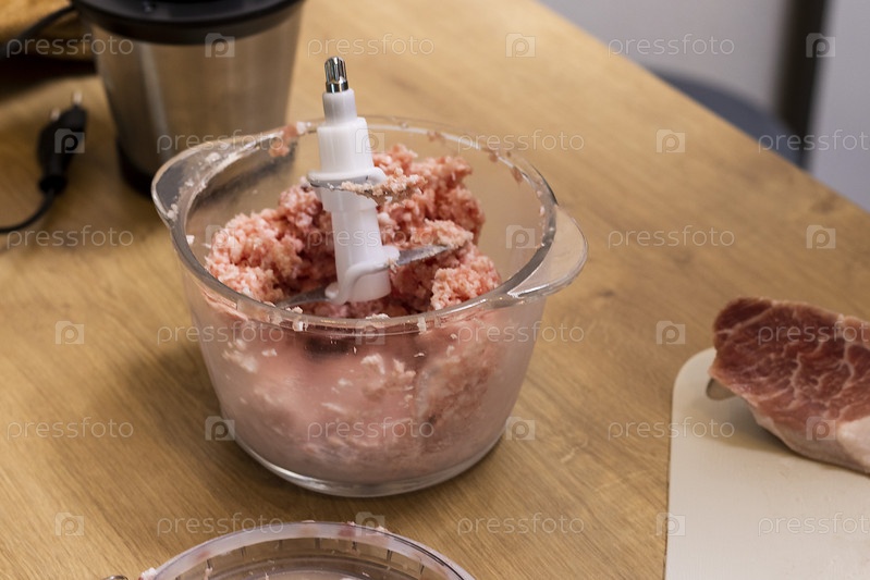 Просто молотый мясной фарш в стеклянной чаше электрического вертолета на кухонной столешнице. готовить