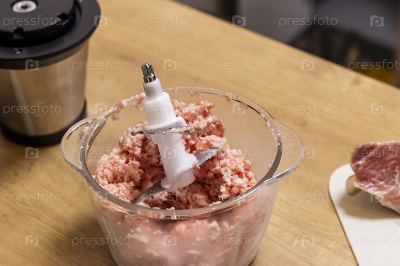 Просто молотый мясной фарш в стеклянном шарике электрического вертолета на кухонной столешнице. готовить