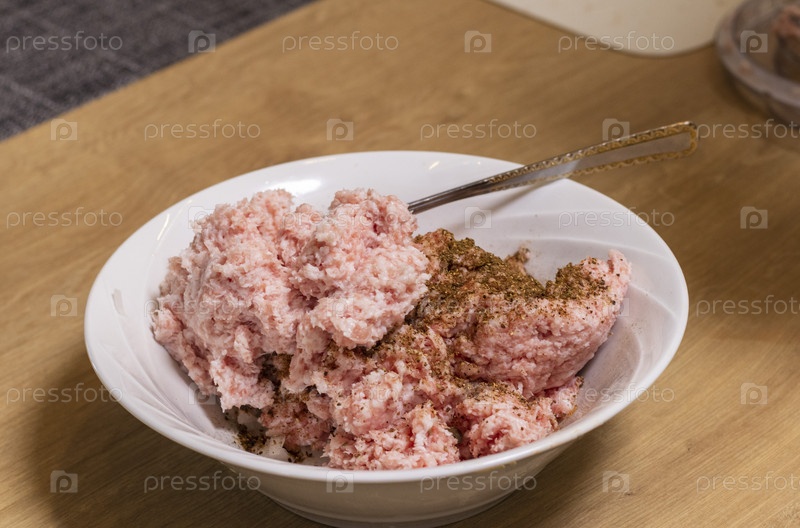 Просто молотый мясной фарш в стеклянной чаше электрического вертолета на кухонной столешнице приправлен и смешан. готовить