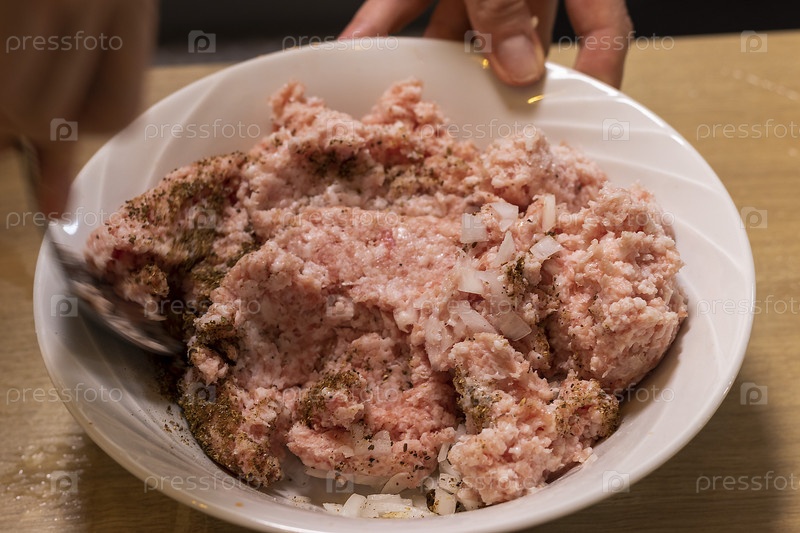 Просто молотый мясной фарш в стеклянной чаше электрического вертолета на кухонной столешнице приправлен и смешан. готовить