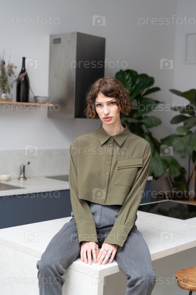 Молодая красивая женщина в студии, сидящая в рубашке в кресле