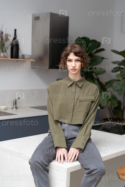 Молодая красивая женщина в студии, сидящая в рубашке в кресле