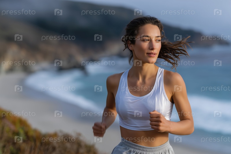 Молодая женщина утром бежит по пляжу. Концепция здорового образа жизни