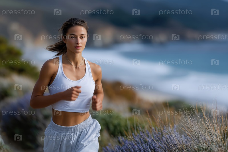 Молодая женщина бежит на берегу моря в солнечный день. Концепция здорового образа жизни