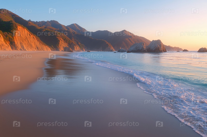 Закат на океанском пляже с камнями на расстоянии