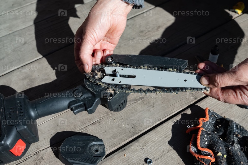 Мужчина ремонтирует электрическую пилу. Смазка цепи