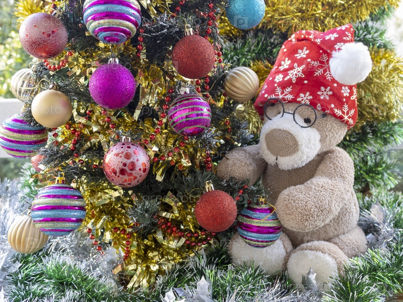 Плюшевый медвежонок в рождественской шапке Санты украшает новогоднюю елку