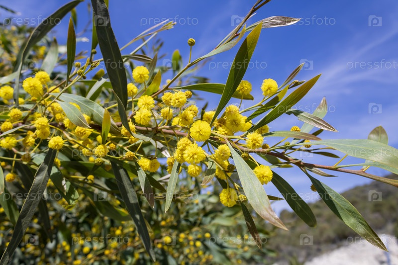 Ветка мимозы с желтыми цветами и зелеными листьями на фоне голубого неба