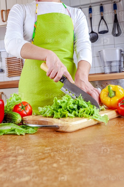 Женщина рубит салат на разделочной доске