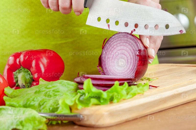Женщина рубит красный лук на разделочной доске